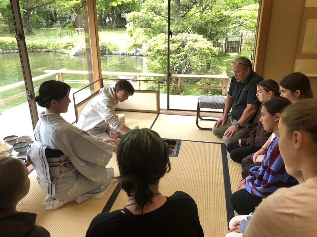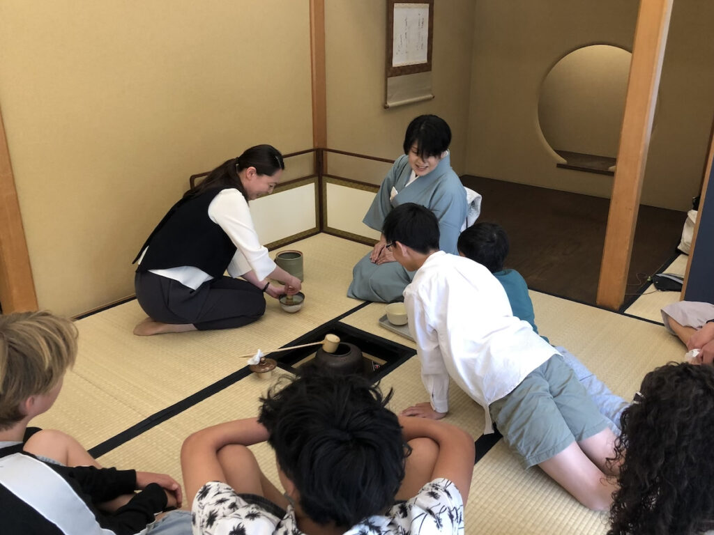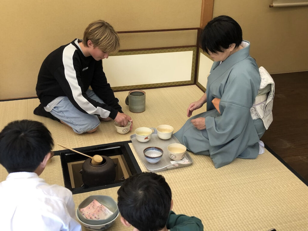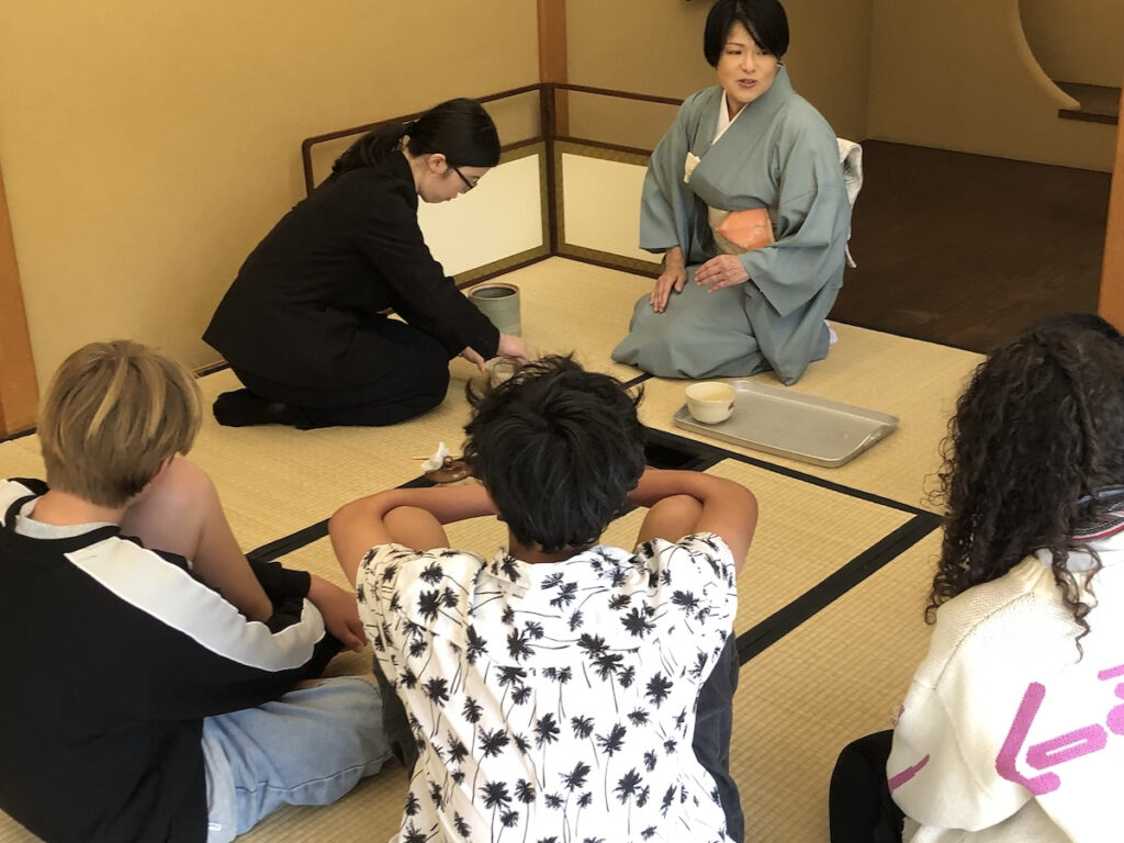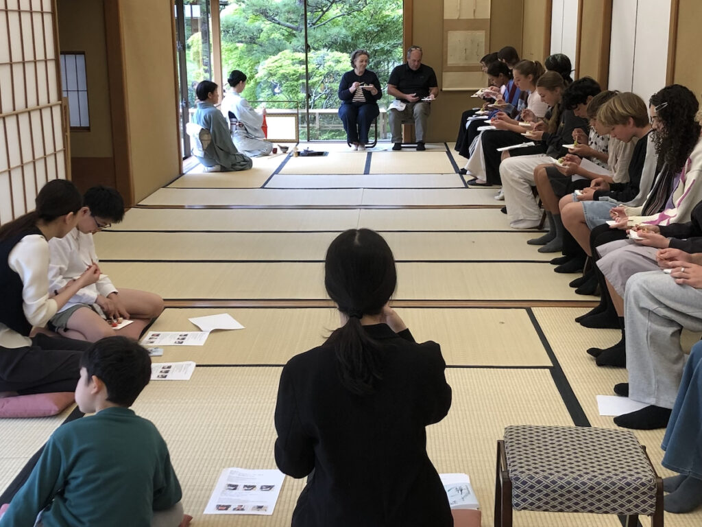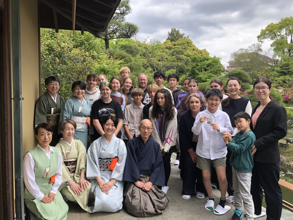 2026年4月25日、源心庵で、ニュージーランドからの高校生と先生16名、子ども会から4名、ことぶき会から1名の計24名で交流茶会が開催されました。
