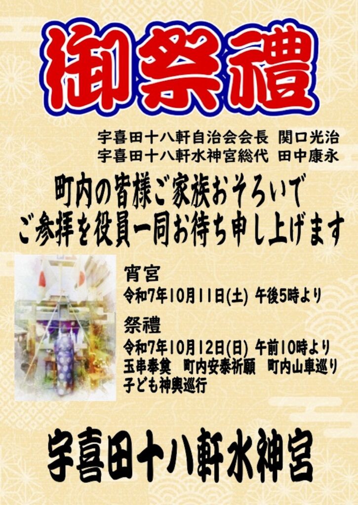今年も恒例の、宇喜田十八軒水神宮御祭禮が行われます。